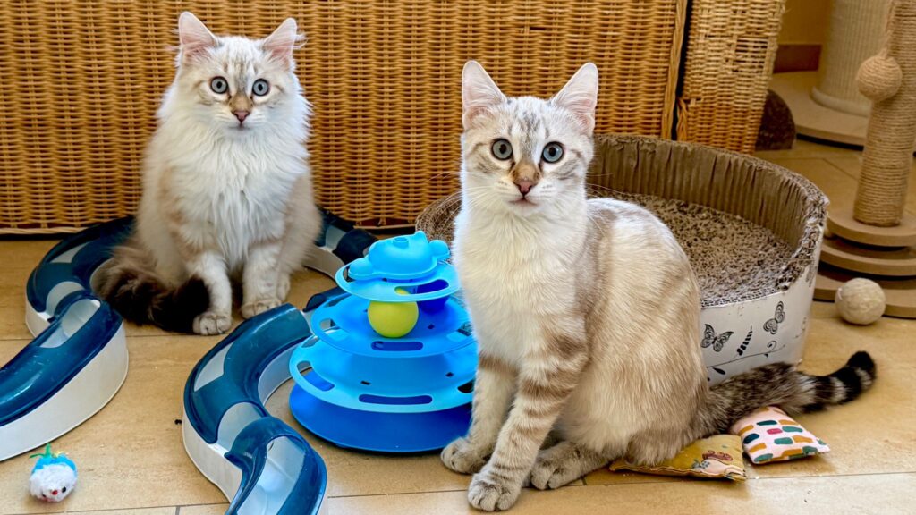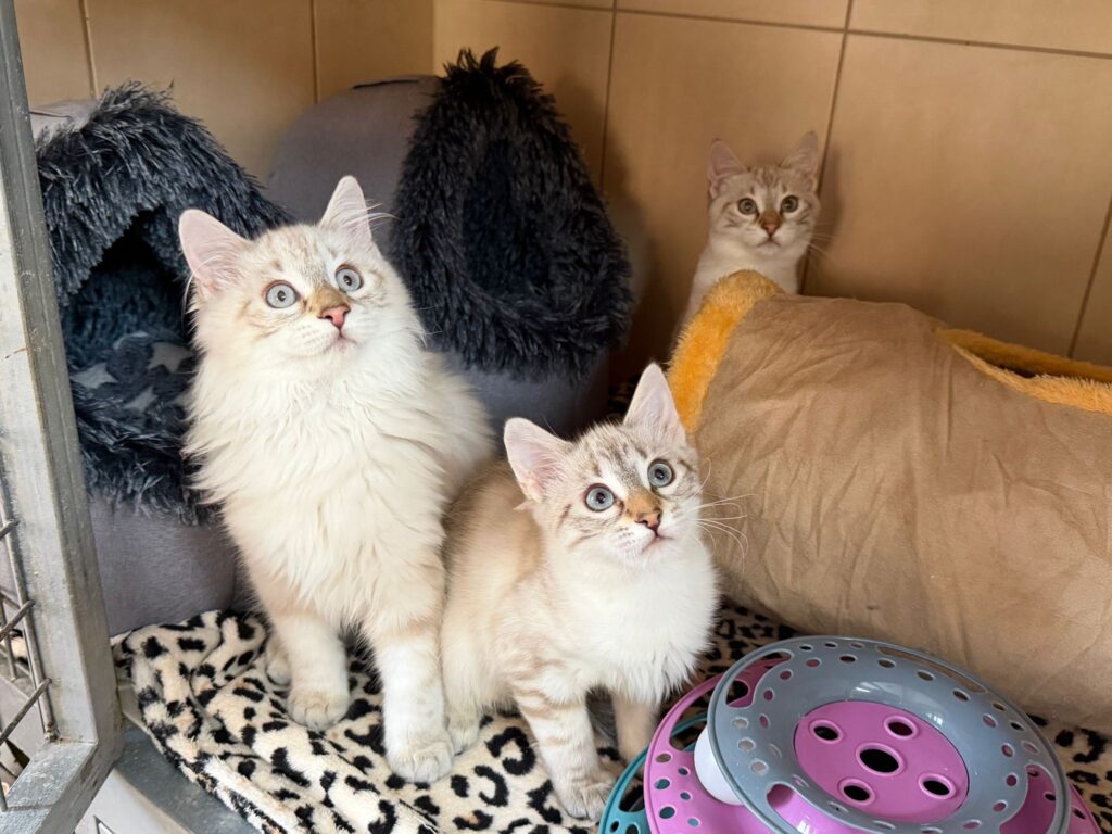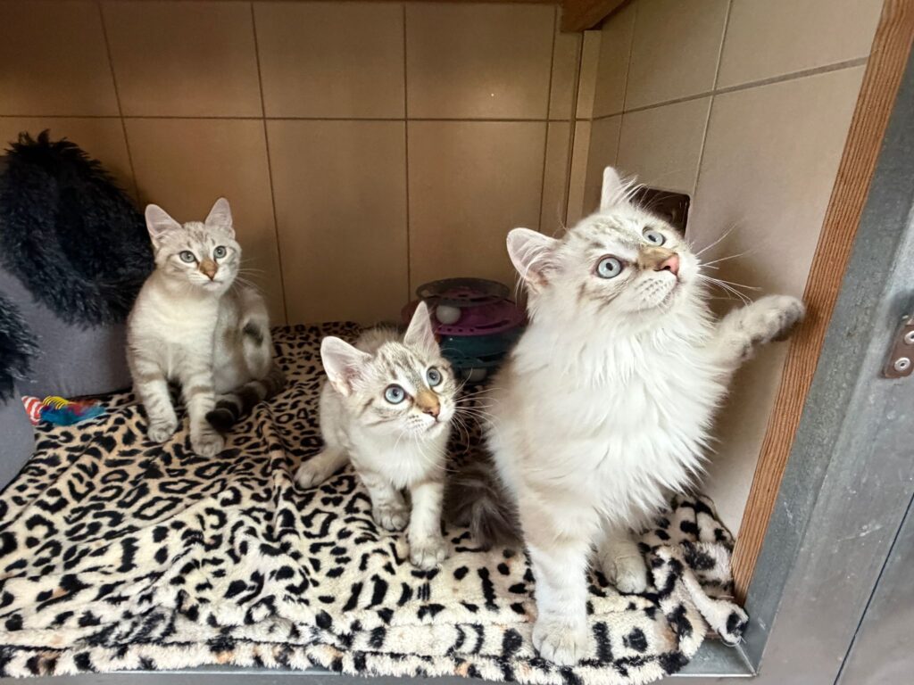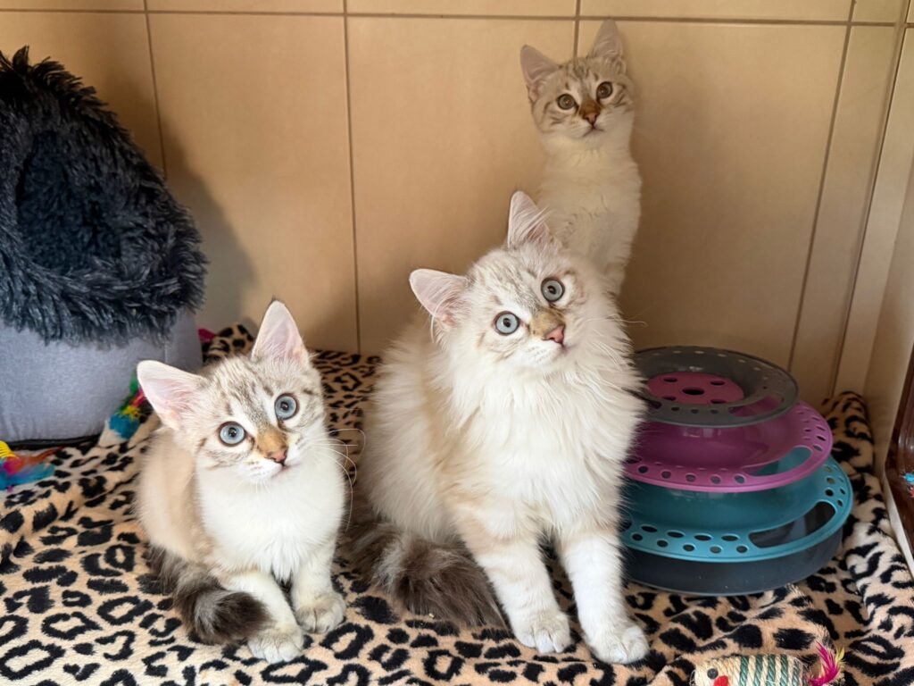 Alle drei haben eine außergewöhnliche Fellzeichnung, leuchtend blaue Augen und ein sanftes, menschenbezogenes Gemüt.